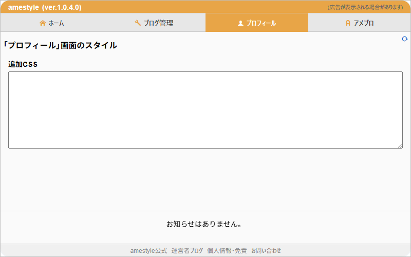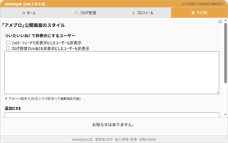Amebaホーム画面の表示を独自にカスタマイズするための追加CSSを記述します。