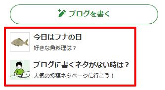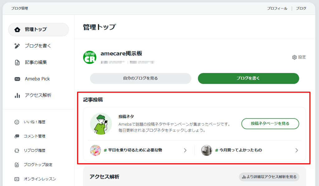 - 「ブログを書く」ボタンの下に表示される下の画像の赤枠で囲った箇所のようなリンクを非表示にします。